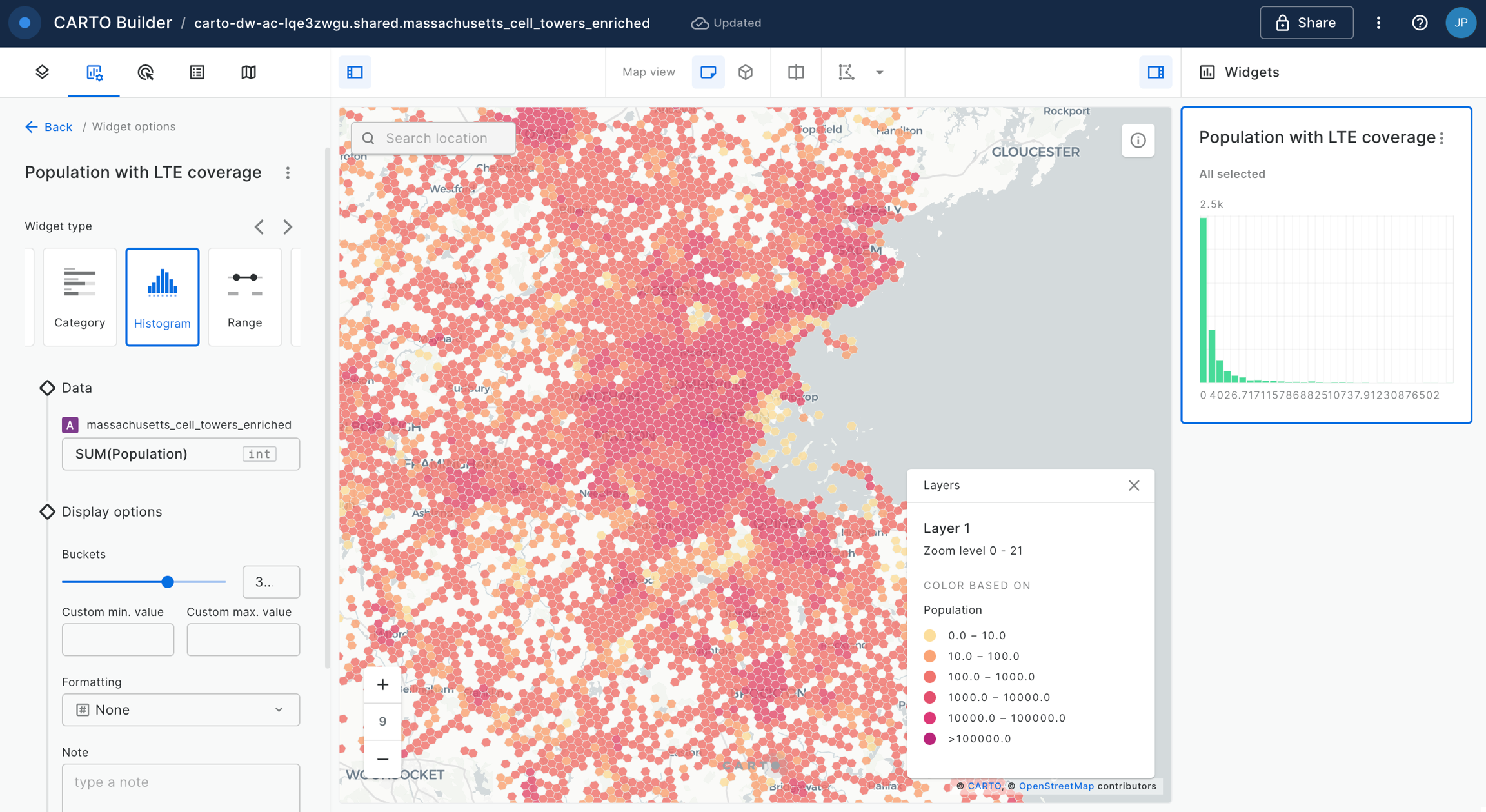And we can add widgets in order to further explore and filter our data. For example we are going to add an Histogram widget based on the population column.