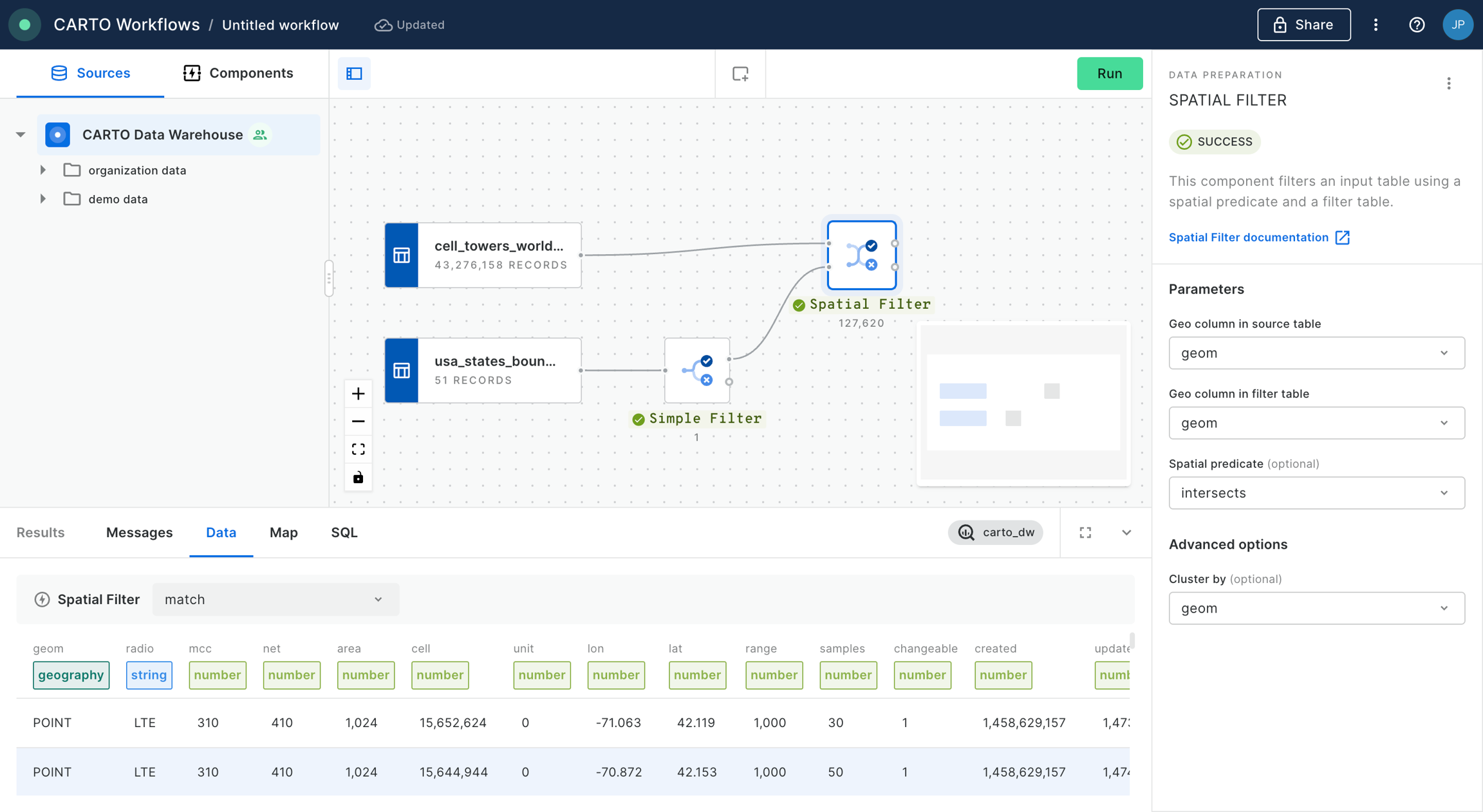 We configure the “Spatial Filter” with the “intersects” predicate, and identify the “geom” column for both inputs. We click “Run”.