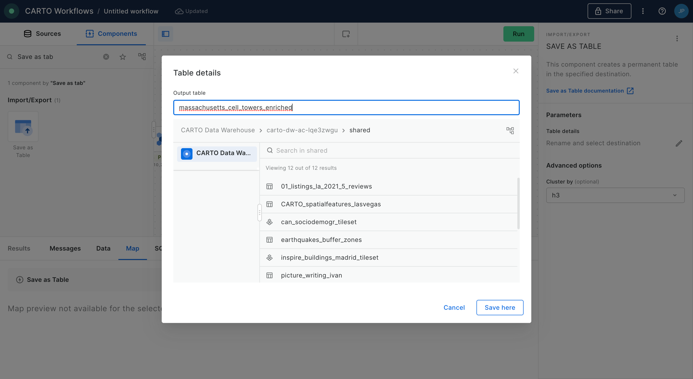 Finally, we are going to save the result of our workflow as a new table in our data warehouse. For that, we are going to add the component “Save as table” into the canvas and connect the output of the previous step where we performed the “Join” operation. In this example we are going to save the table in our CARTO Data Warehouse, in the dataset “shared” within “organization data”. We click “Run”.