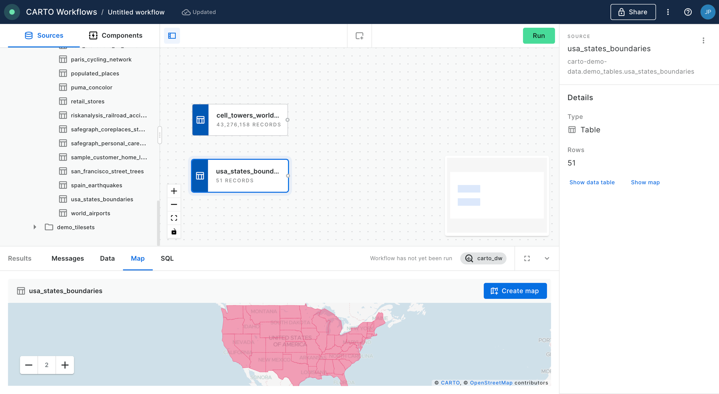 usa_states_boundariesinto the workflows canvas; this table is also available in demo data.