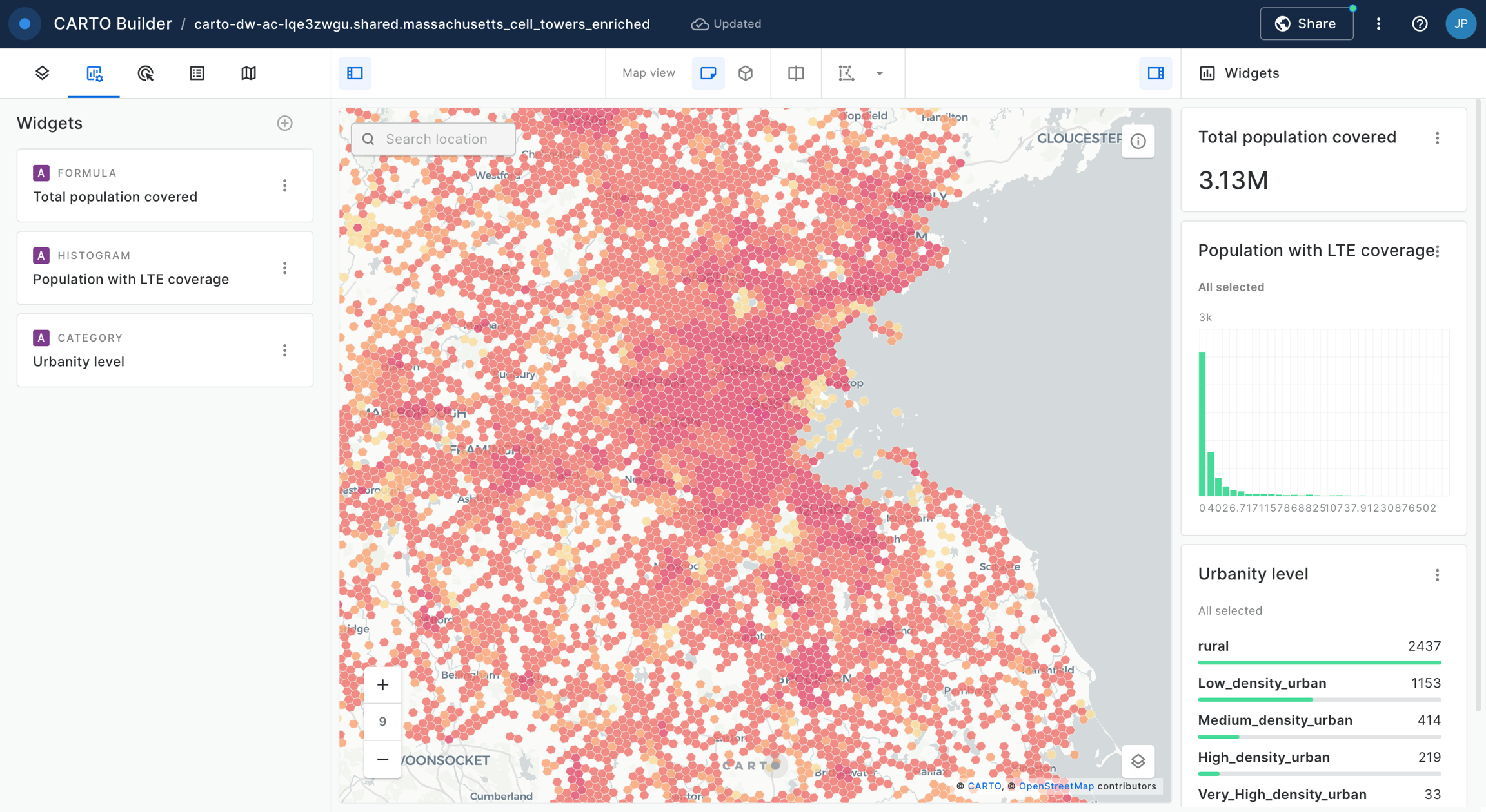 In this tutorial we are going to estimate and analyze the population that is covered by LTE cells from the telecommunications infrastructure. In order to do that we are going to jointly analyze data with the location of the different LTE cells worldwide and a dataset of spatial features such as population, other demographic variables, urbanity level, etc. We will start by using CARTO Workflows to create a multi-step analysis to merge both sources of data, and we will then use CARTO Builder to create an interactive dashboard to further explore the data and generate insights.