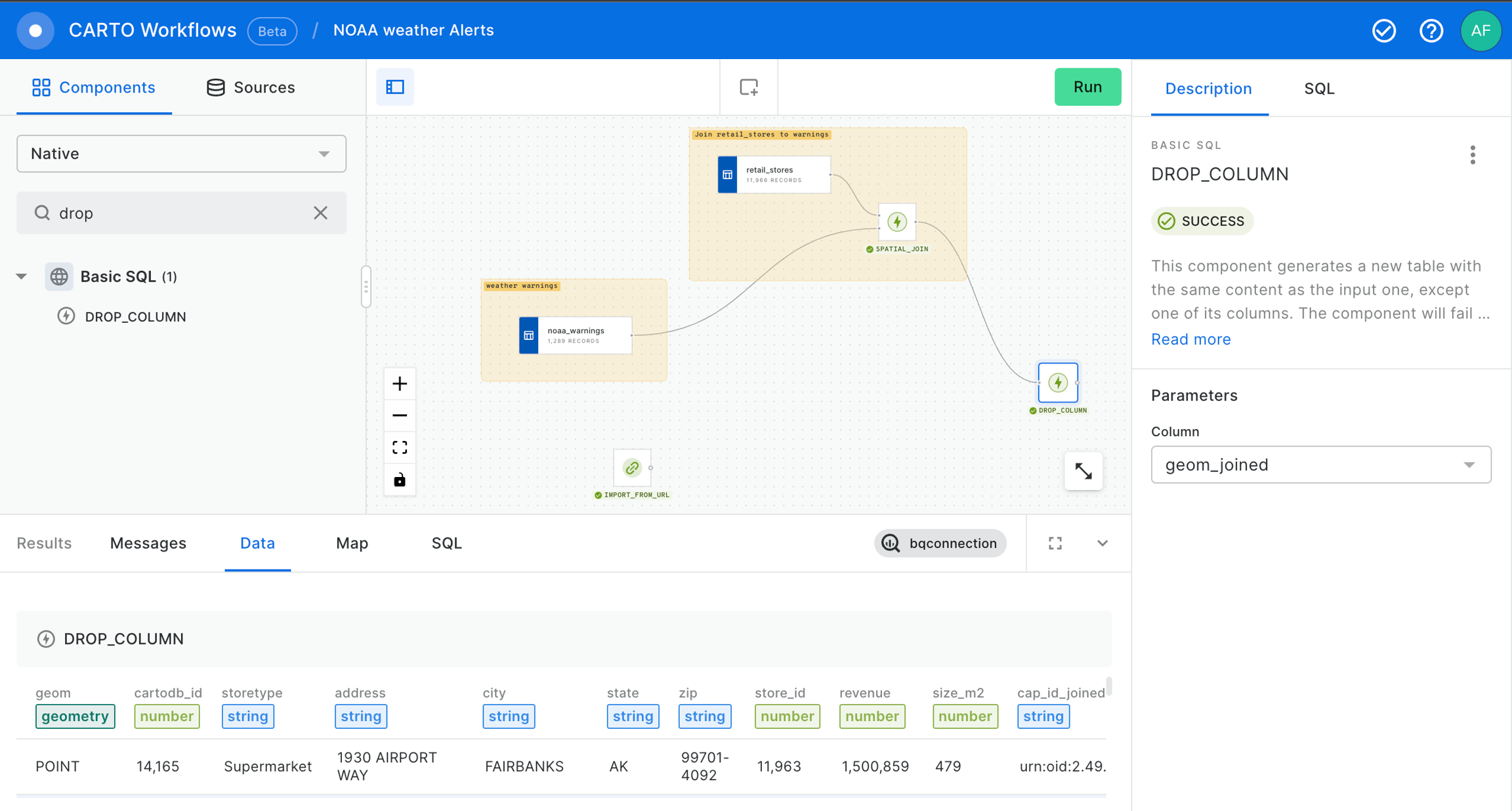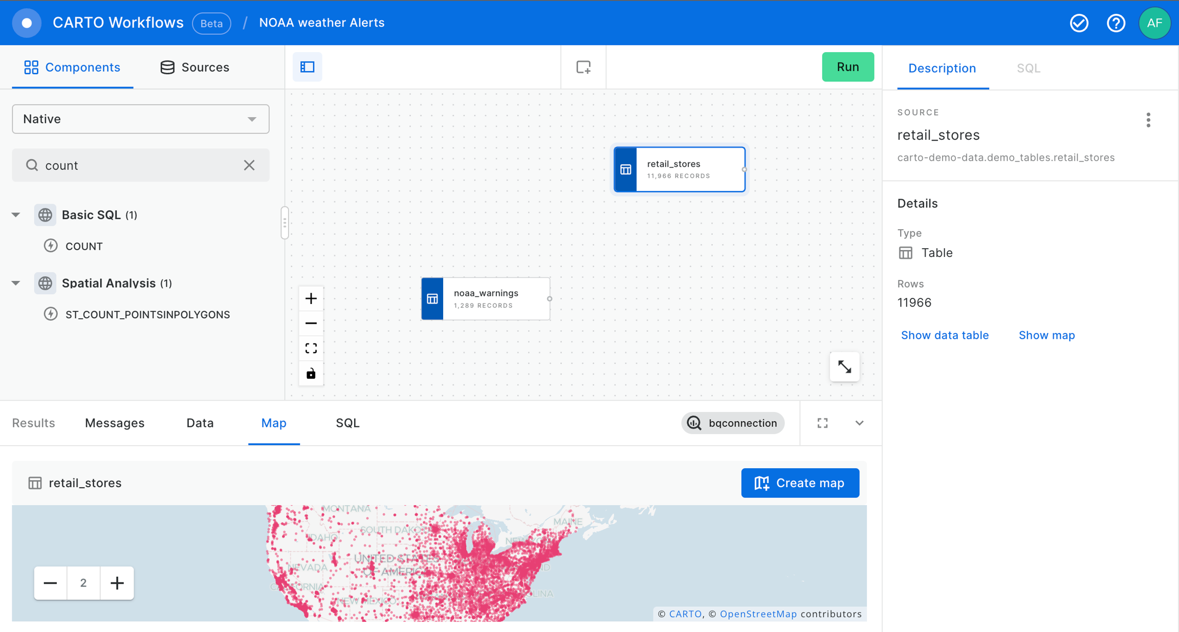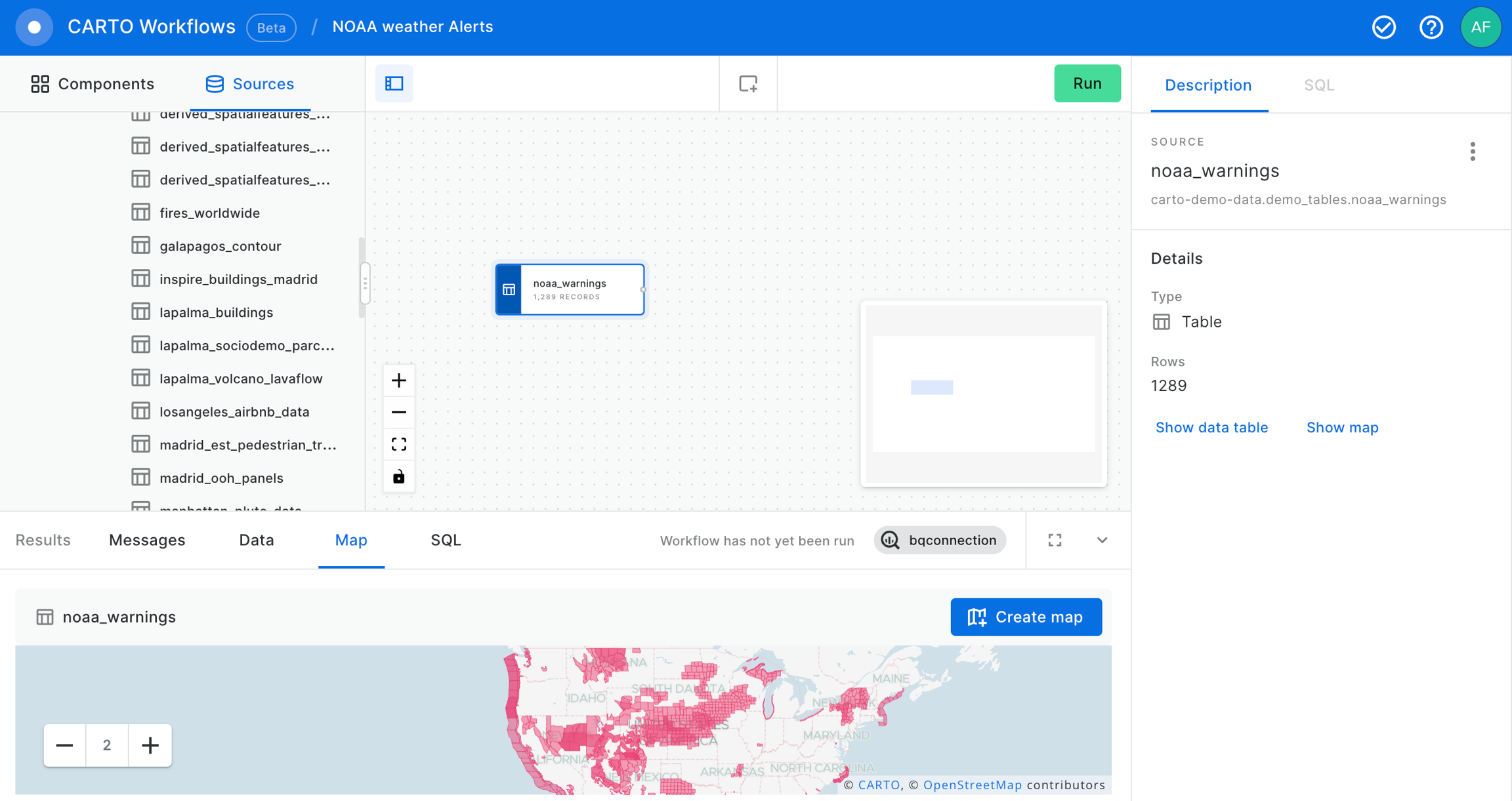 Now, let's add the noaa_warnings data table into our workflow from the demo_tables dataset available in the CARTO Data Warehouse connection.
