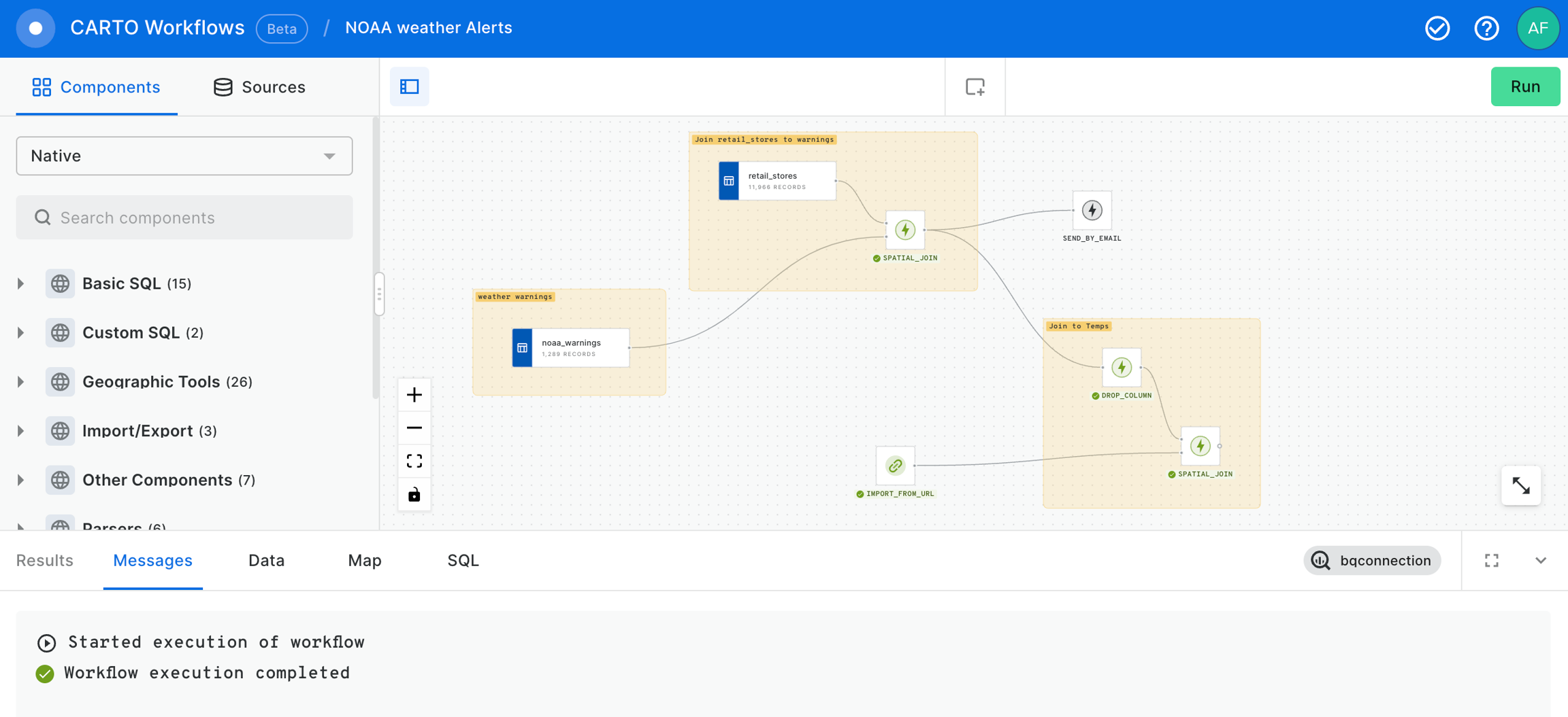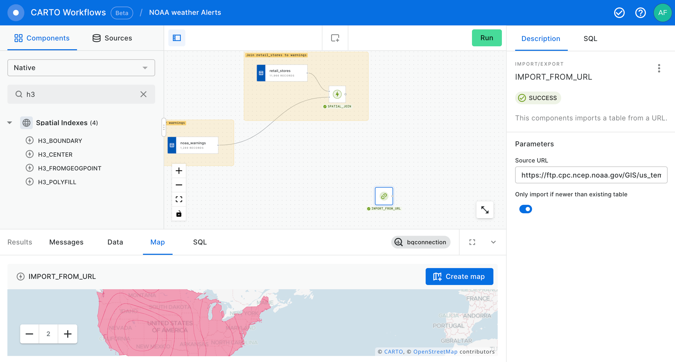 In this example we use CARTO Workflows to ingest data from a remote file containing temperature forecasts in the US together with weather risk data from NOAA, and data with the location of our stores; we will identify which of the stores are located in areas with weather risks or strong deviations in temperature.
