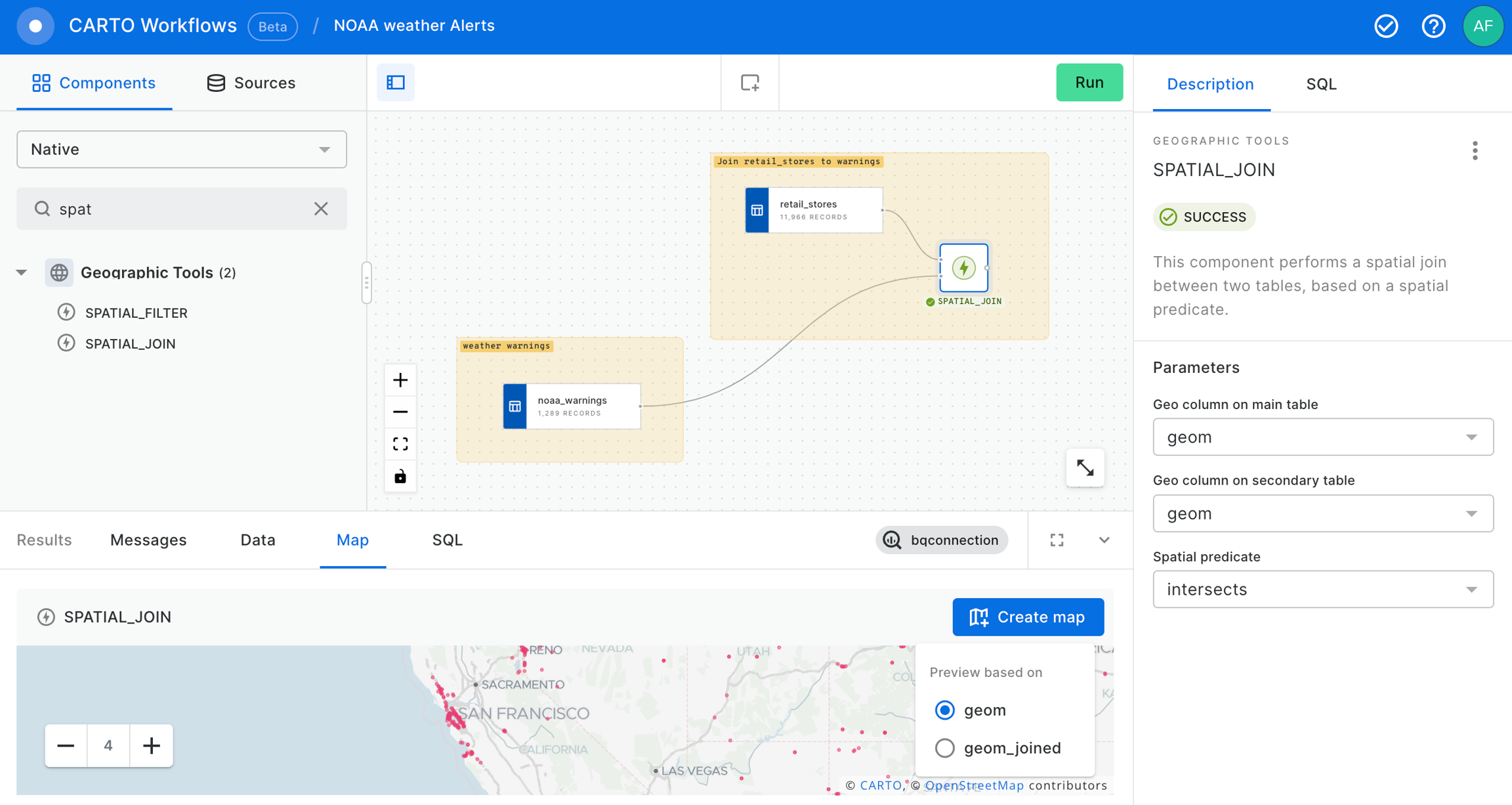 Now let's use the SPATIAL_JOIN component to know which of our retail_stores are in the warning areas.