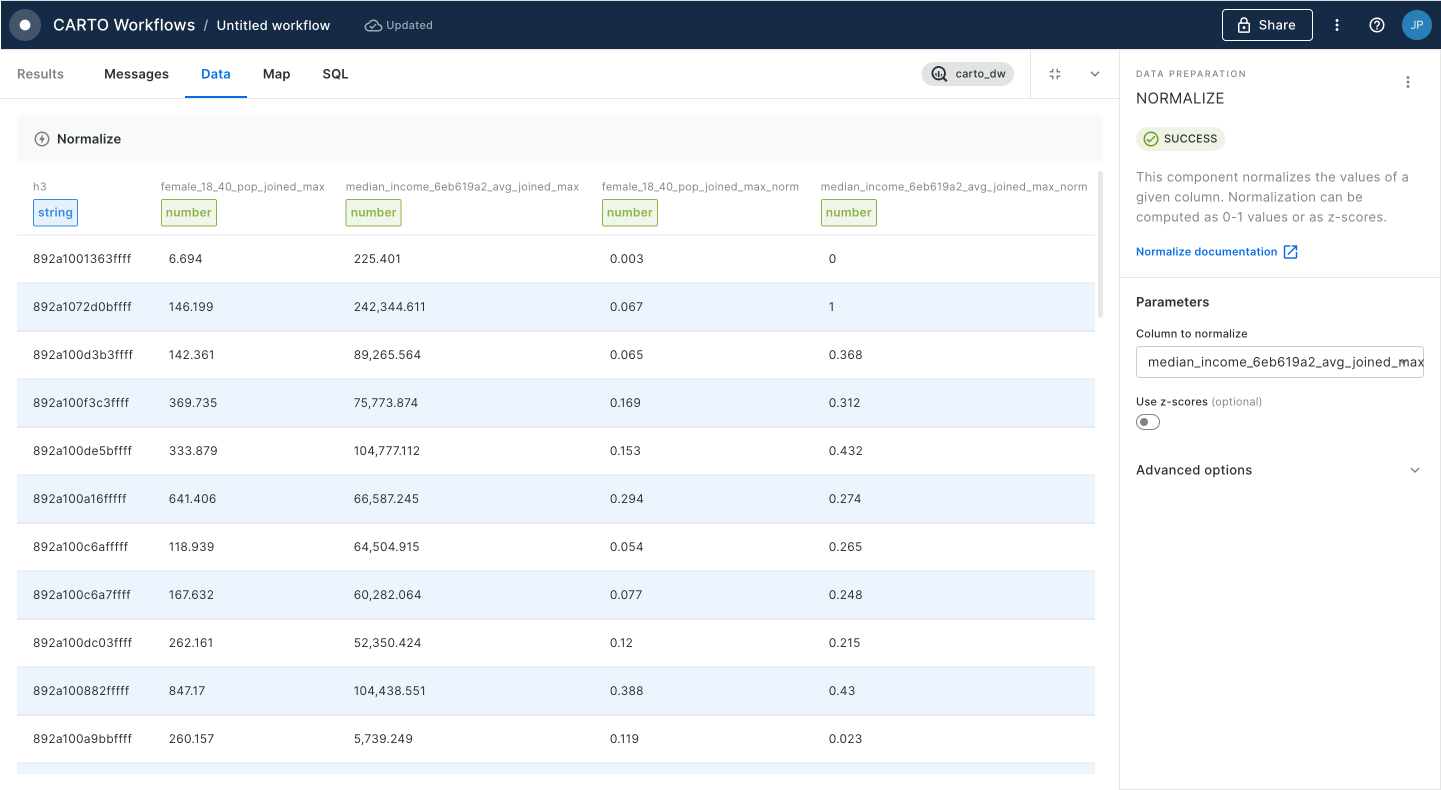 Now, if you check our last output table we have 2 new columns with the result of the normalization: female_18_40_pop_joined_max_norm and median_income_6eb619a2_avg_joined_max_norm.