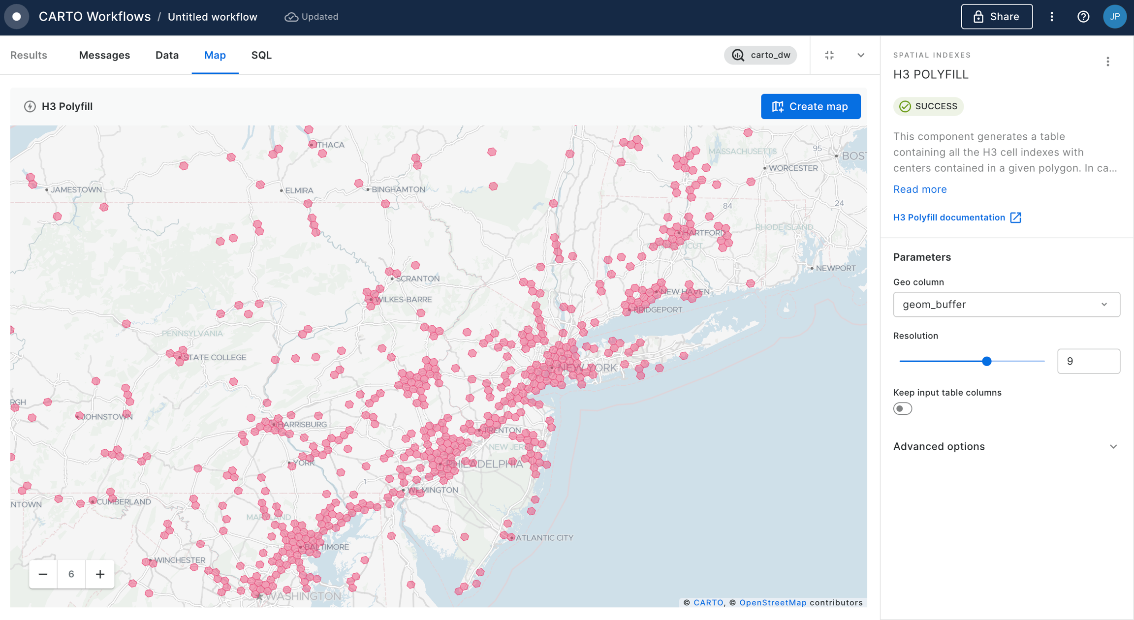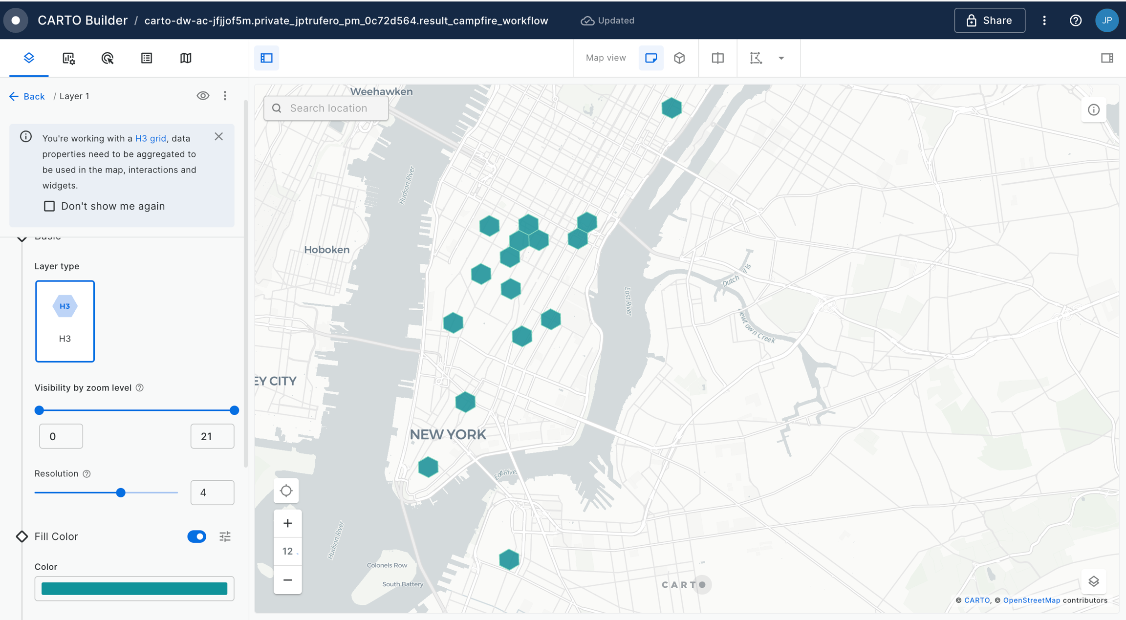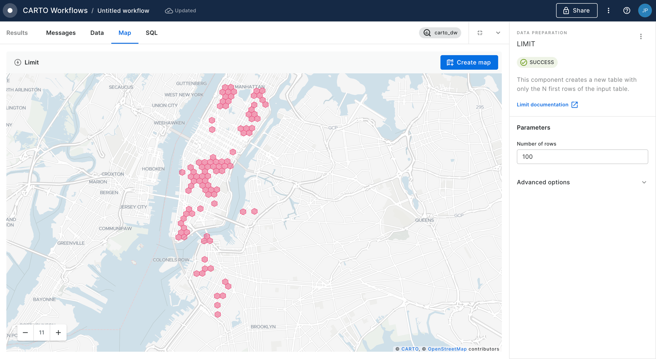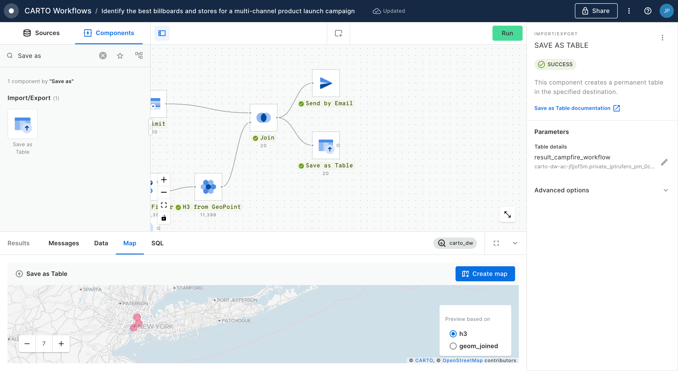 With this output we can now add components Save as table and Send by email to ensure our colleagues know about this insight and we keep the result saved in our data warehouse. From there, we can click on "Create map" to open a map in CARTO Builder with the result of our workflow as a layer.