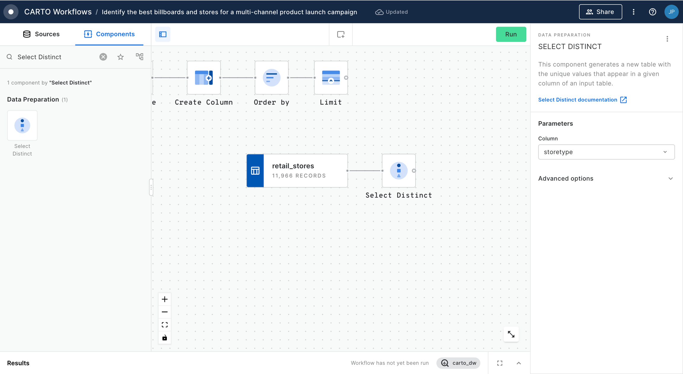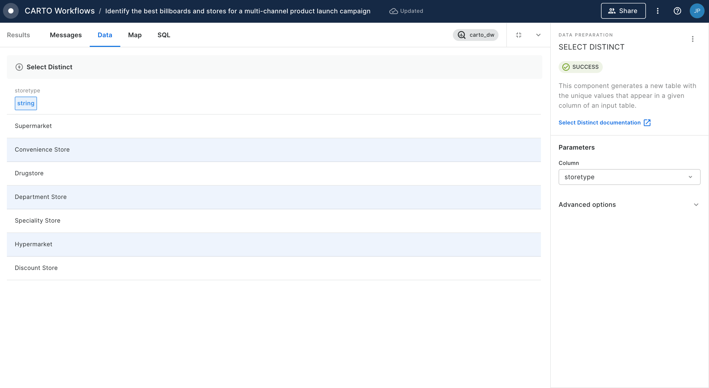 We are going to add a Select Distinct component to find out what are the different categories of stores that we have in the table. We select the column "storetype" in the Select Distinct configuration. After clicking "Run" we check that we have the following types: Supermarket, Convenience Store, Drugstore, Department Store, Speciality Store, Hypermarket and Discount Store.