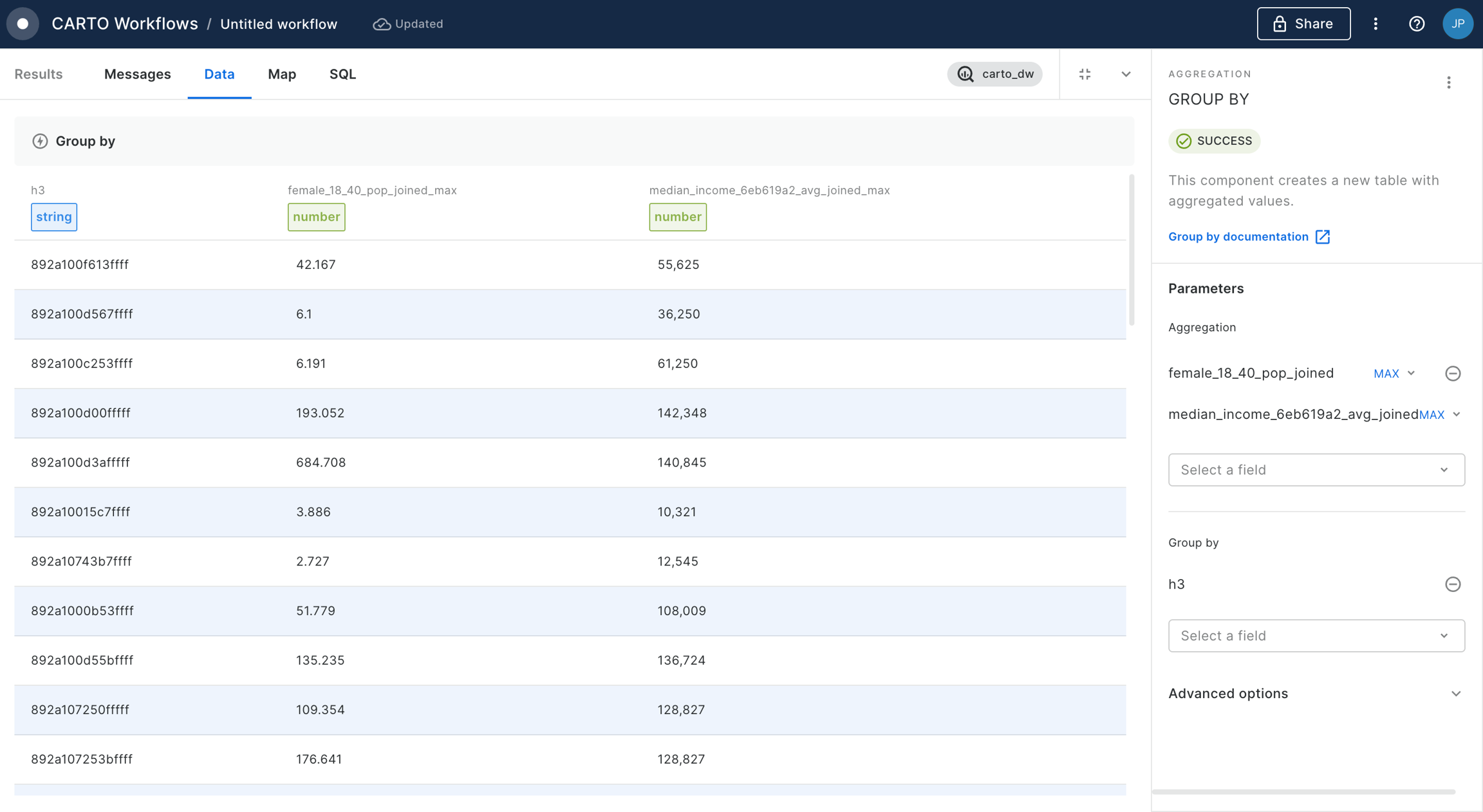 Next step is to remove potentially duplicated H3 cells as the result of the Join operator (e.g. due to surrounding billboards). In order to do that we are going to add a Group by component and we are going to configure aggregations on MAX(female_18_40_pop_joined) and MAX(median_income_6eb619a2_avg_joined) and we are going to group by the column h3.