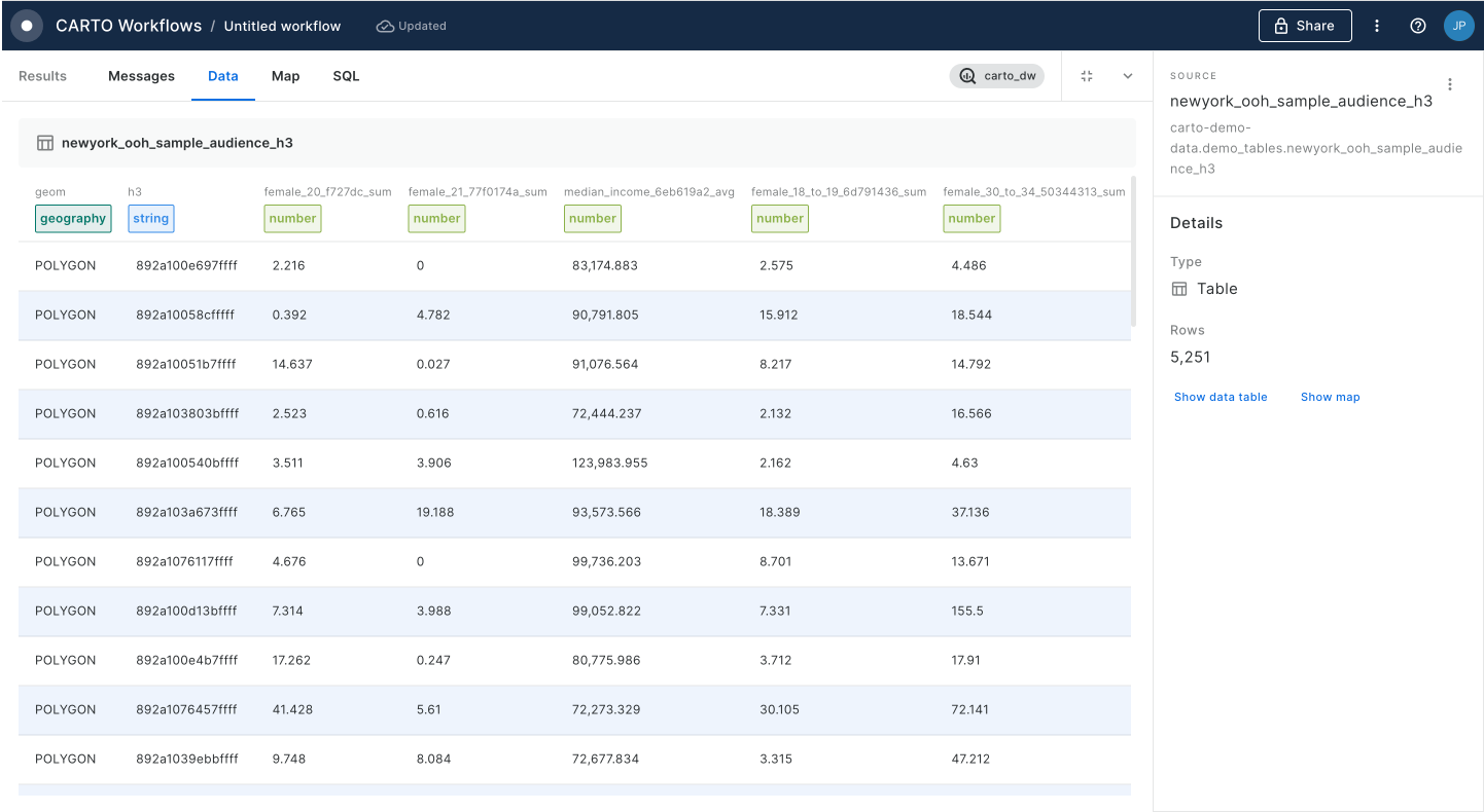 In this example we are going to leverage the H3 spatial index to combine data from multiple tables and perform our analysis. For illustrative purposes, we are going to consider our target audience for the product launch the high income female population between 18 and 40 years old.