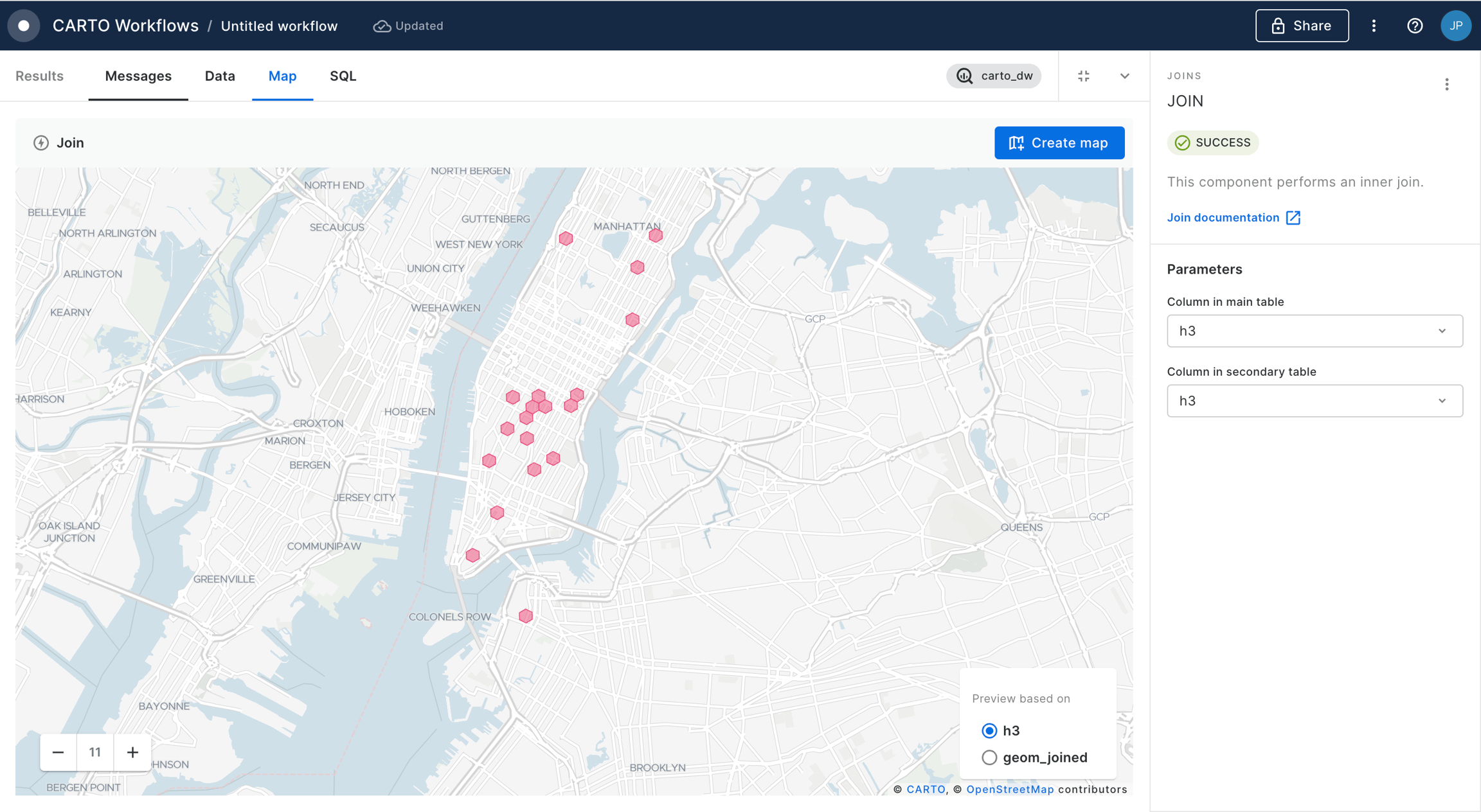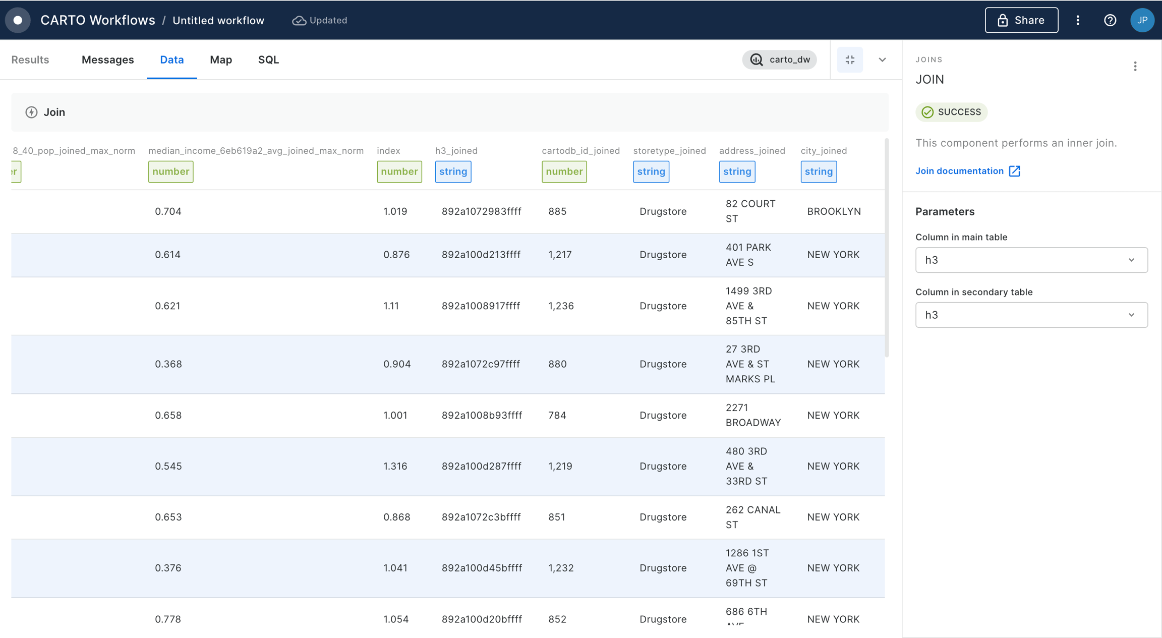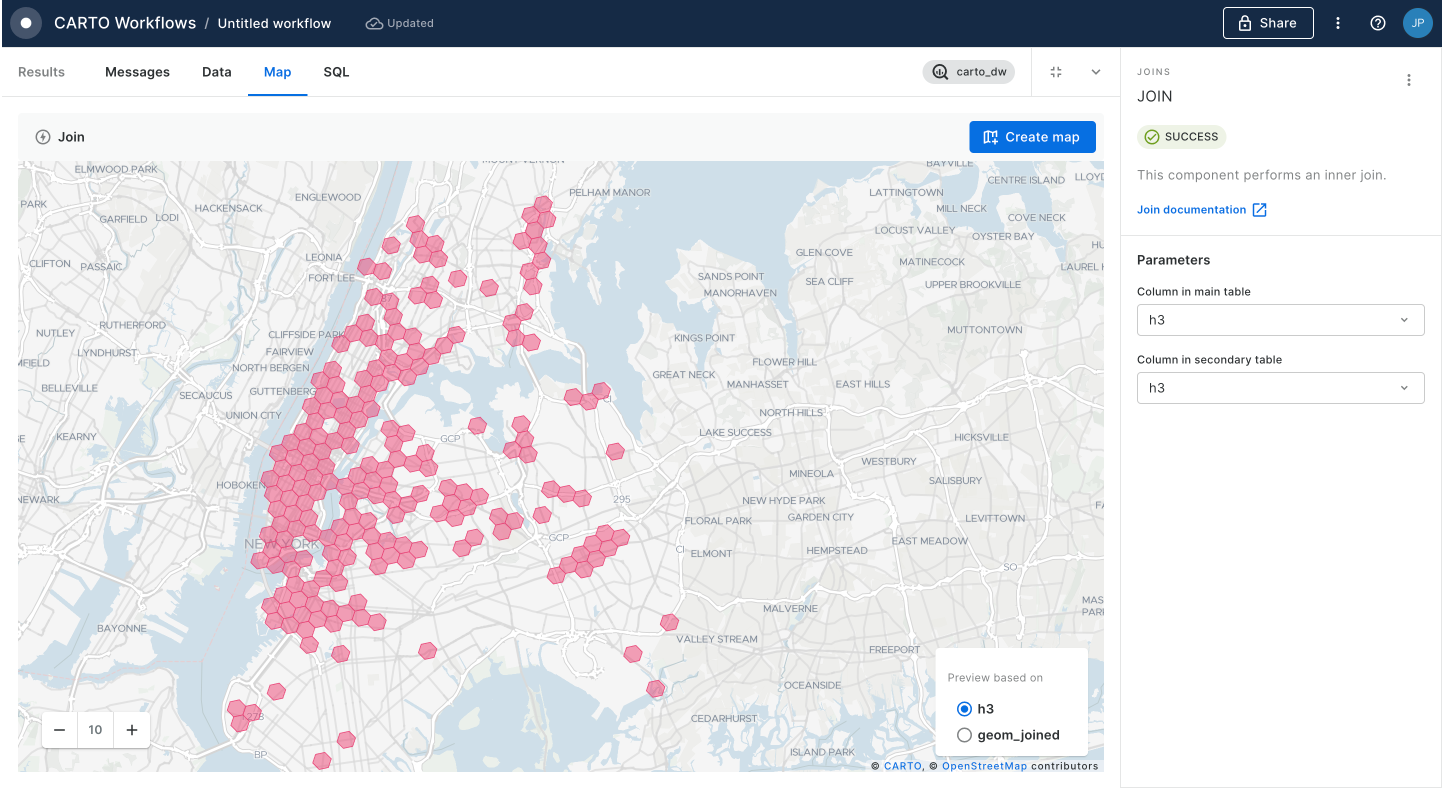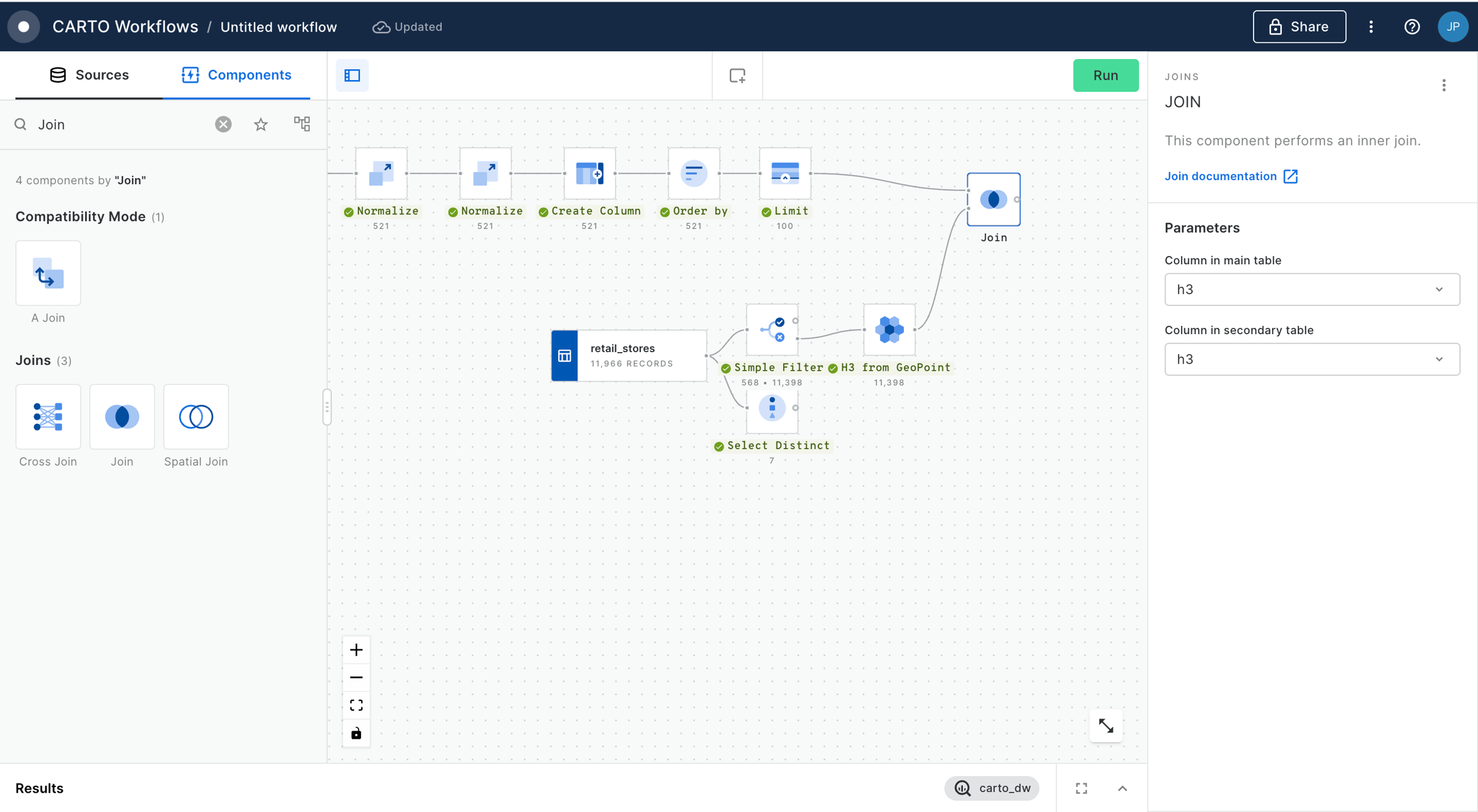 Finally we want to join the H3 cells with the areas surrounding billboards scoring high for our target audience and those with available stores to push our product. To do that we are going to add another Join component and connect the otuputs of both branches of our workflow. We select h3 for both main and secondary tables. We click "Run".