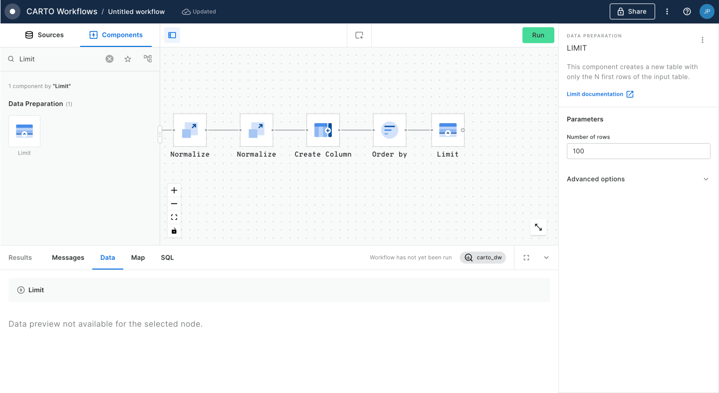 To keep the 100 best areas, we are going to add a Limit component and select '100' as the number of rows.