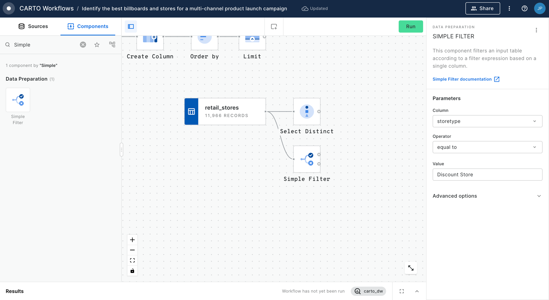 As all store types are relevant to push our new product except of "Discount Store", we are going to add a new Simple Filter component and we will connect the