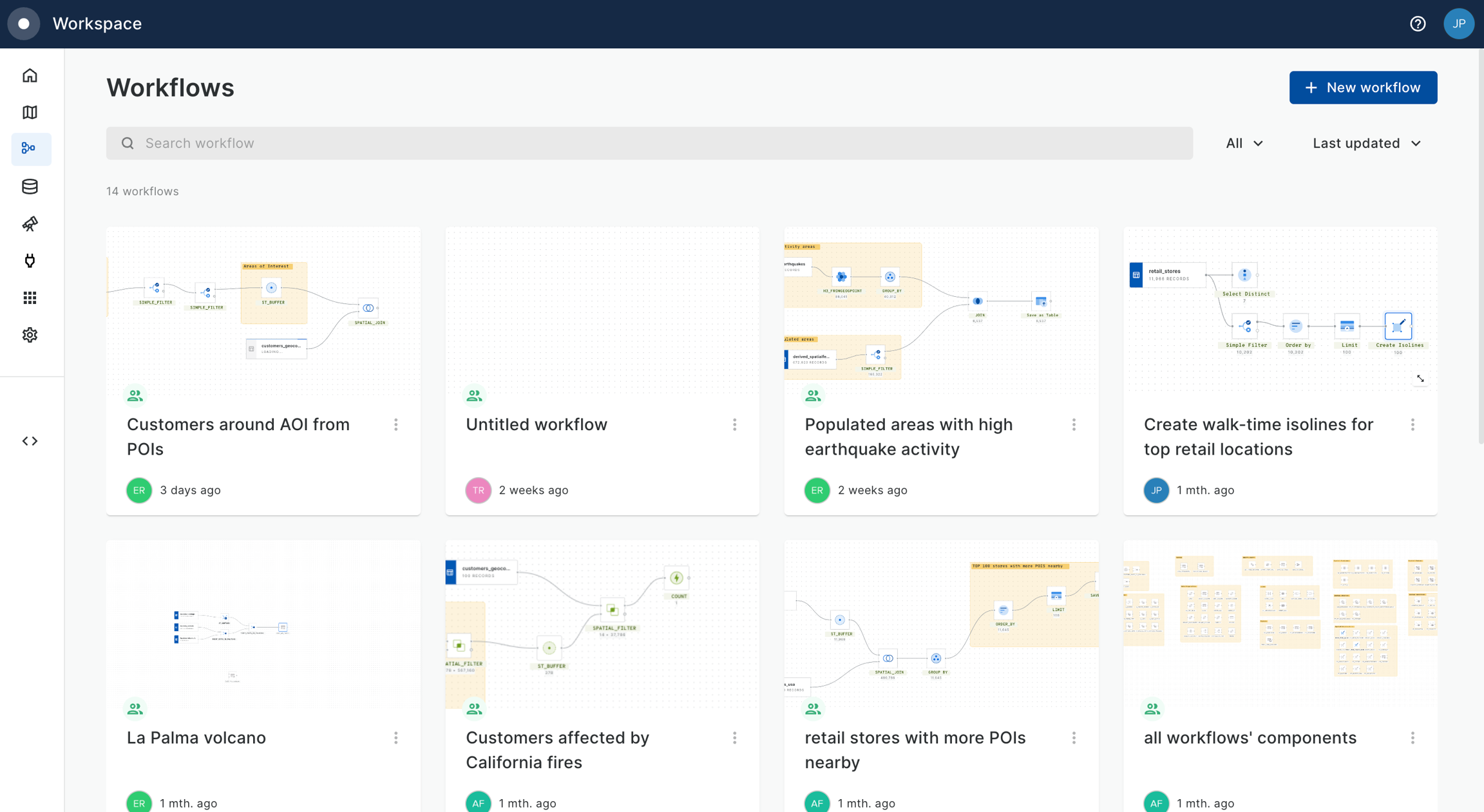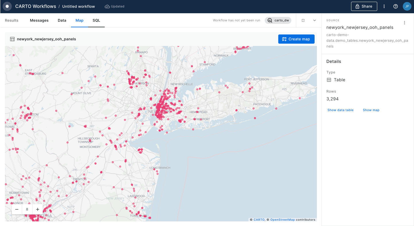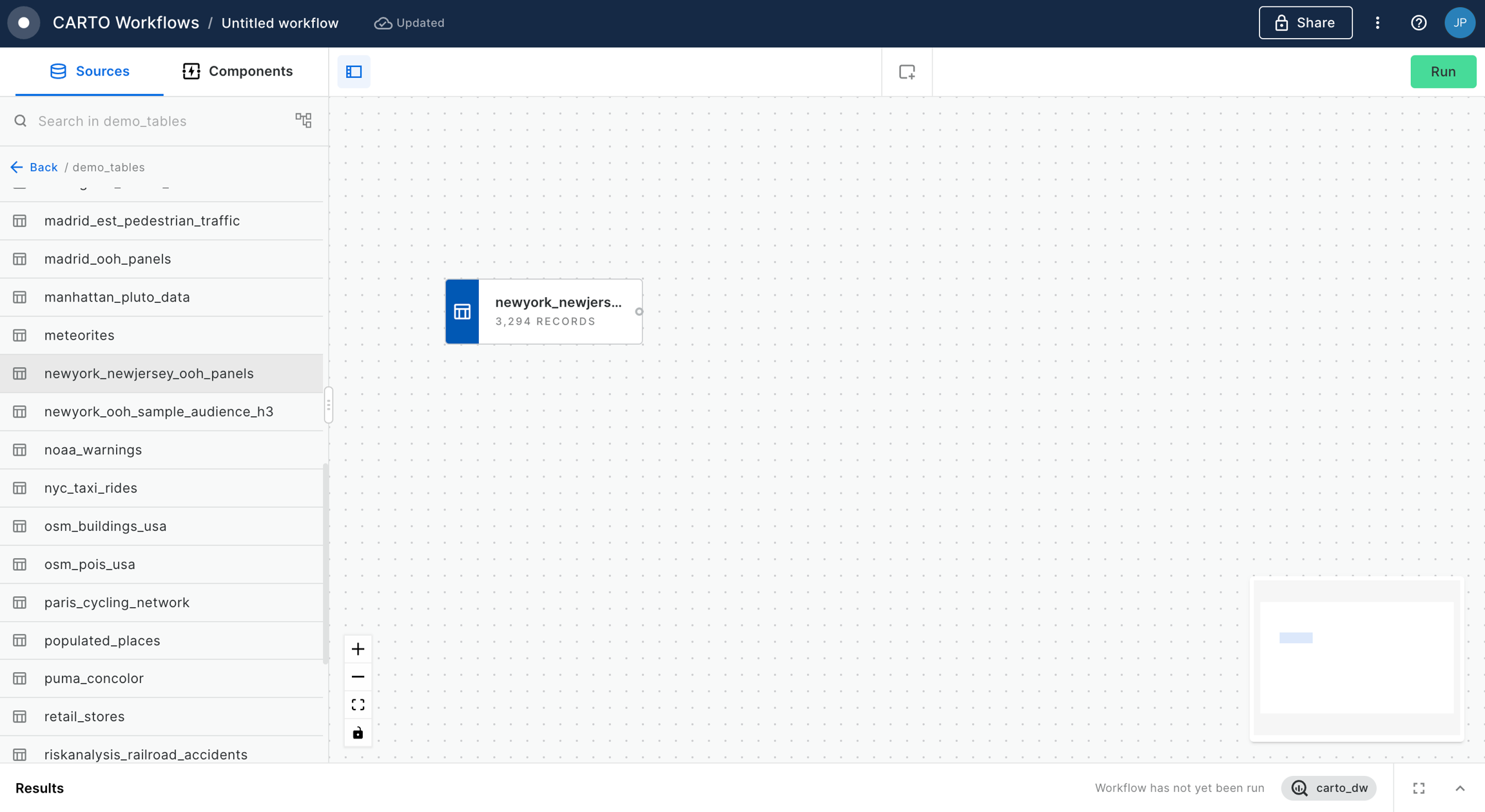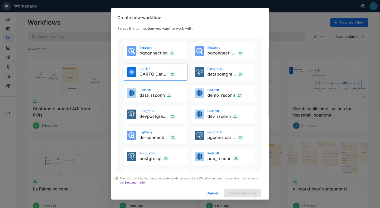 In your CARTO Workspace under the Workflows tab, create a new workflow. In your CARTO Workspace under the Workflows tab, create a new workflow.