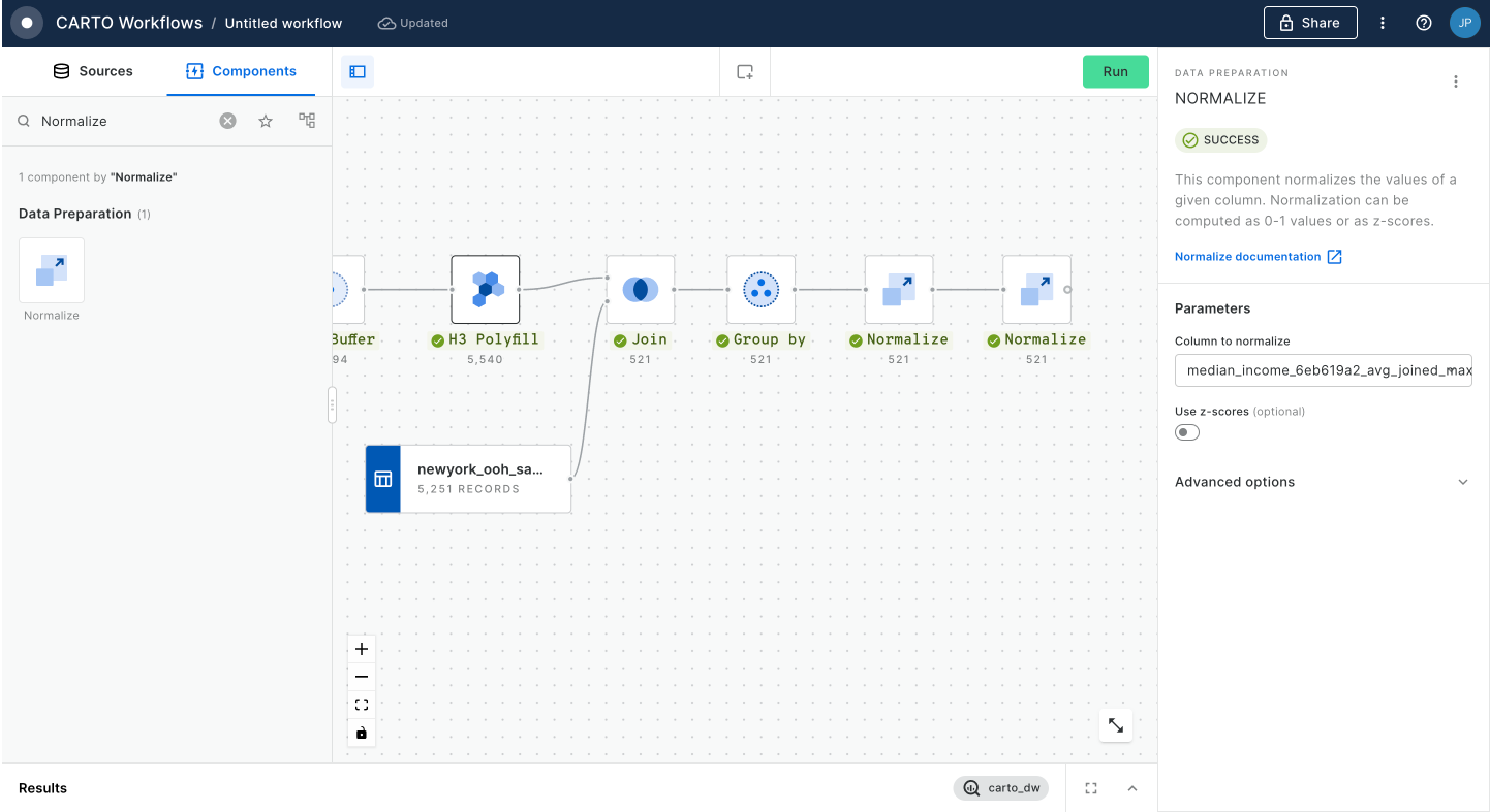 In order to select the best billboard for our product what we will do first is to normalize each of the columns so to get a ratio for each of the h3 cells. For that, we are going to add the Normalize component 2 times, and we are going to normalize our data for each of the columns.