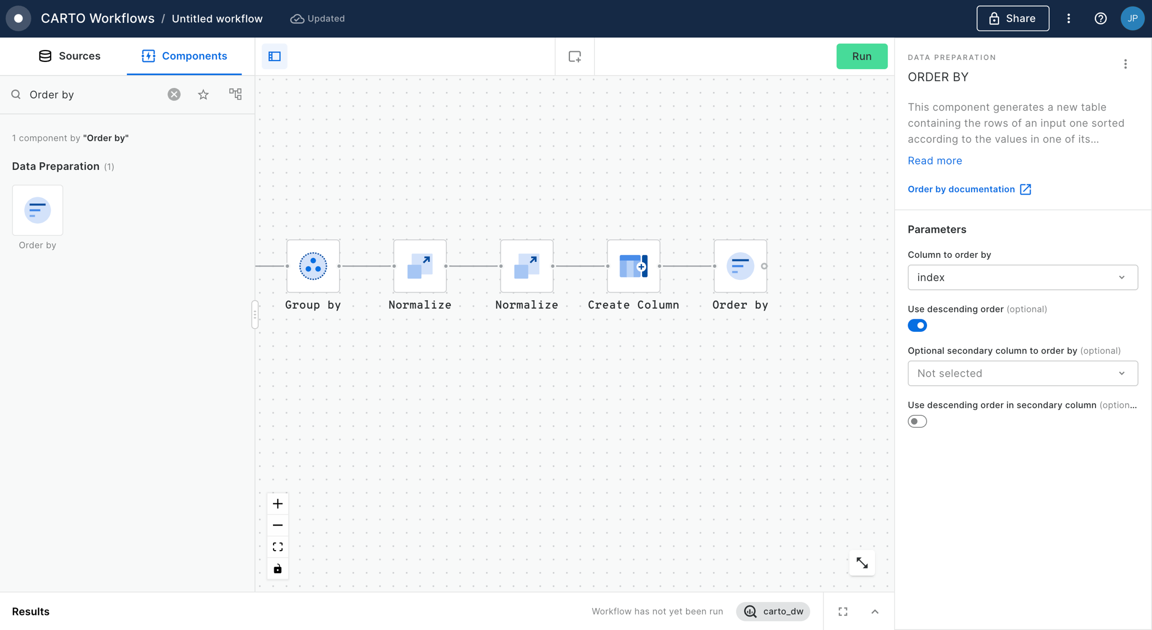 In order to keep the best areas for our out-of-home advertising campaign we are going to add an Order by component and connect the table with the new column. We are going to order our table based on the 'index' column and in 'Descending' order.
