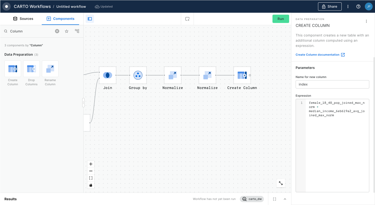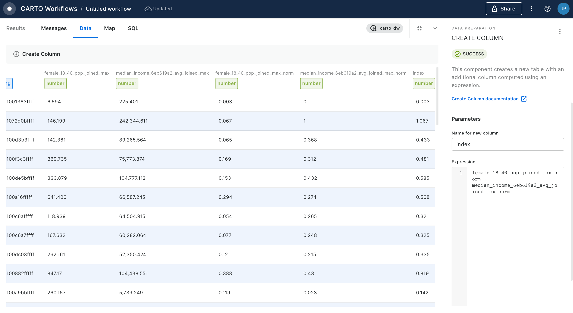 In the next step we are going to create a New Column in the table with a custom expression; we are going to add the result of the normalization in the 2 columns in order to have a single indicator of the relevance of each H3 cell for our target audience. We are going to call the new column 'index' and the expression will be: female_18_40_pop_joined_max_norm + median_income_6eb619a2_avg_joined_max_norm.