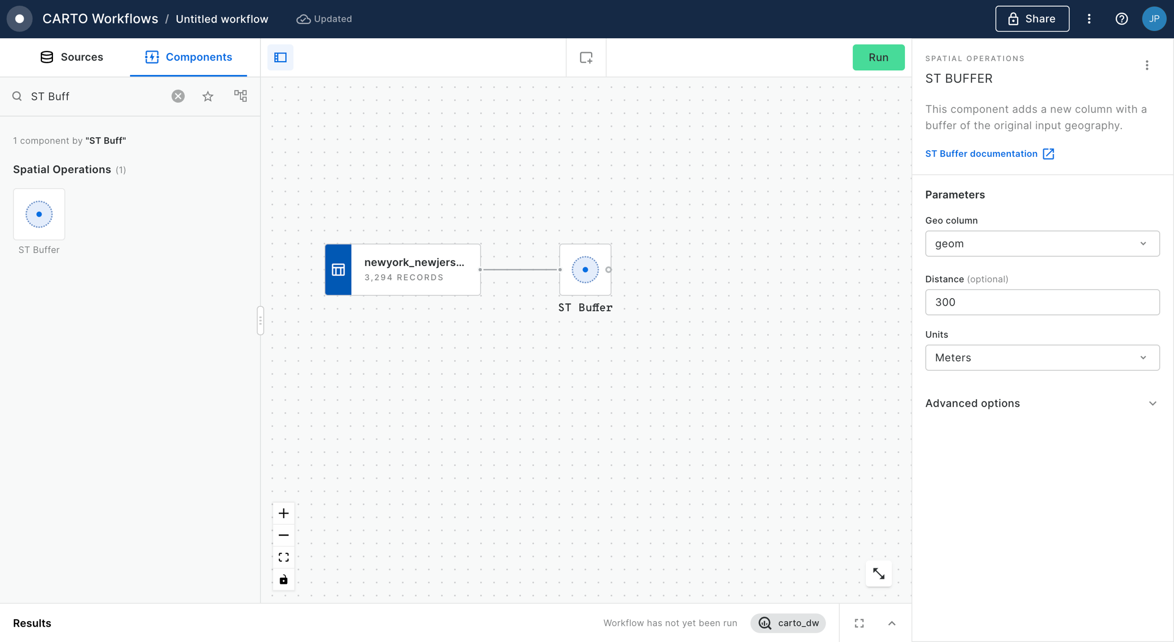 We are going to create 300 meters buffers around each billboard. To do that, we add the ST Buffer component into the canvas and we connect the data source to its input. Then, in the node configuration panel we select 'geom' as the Geo column, '300' as the distance and 'meters' as the units. We click on "Run".
