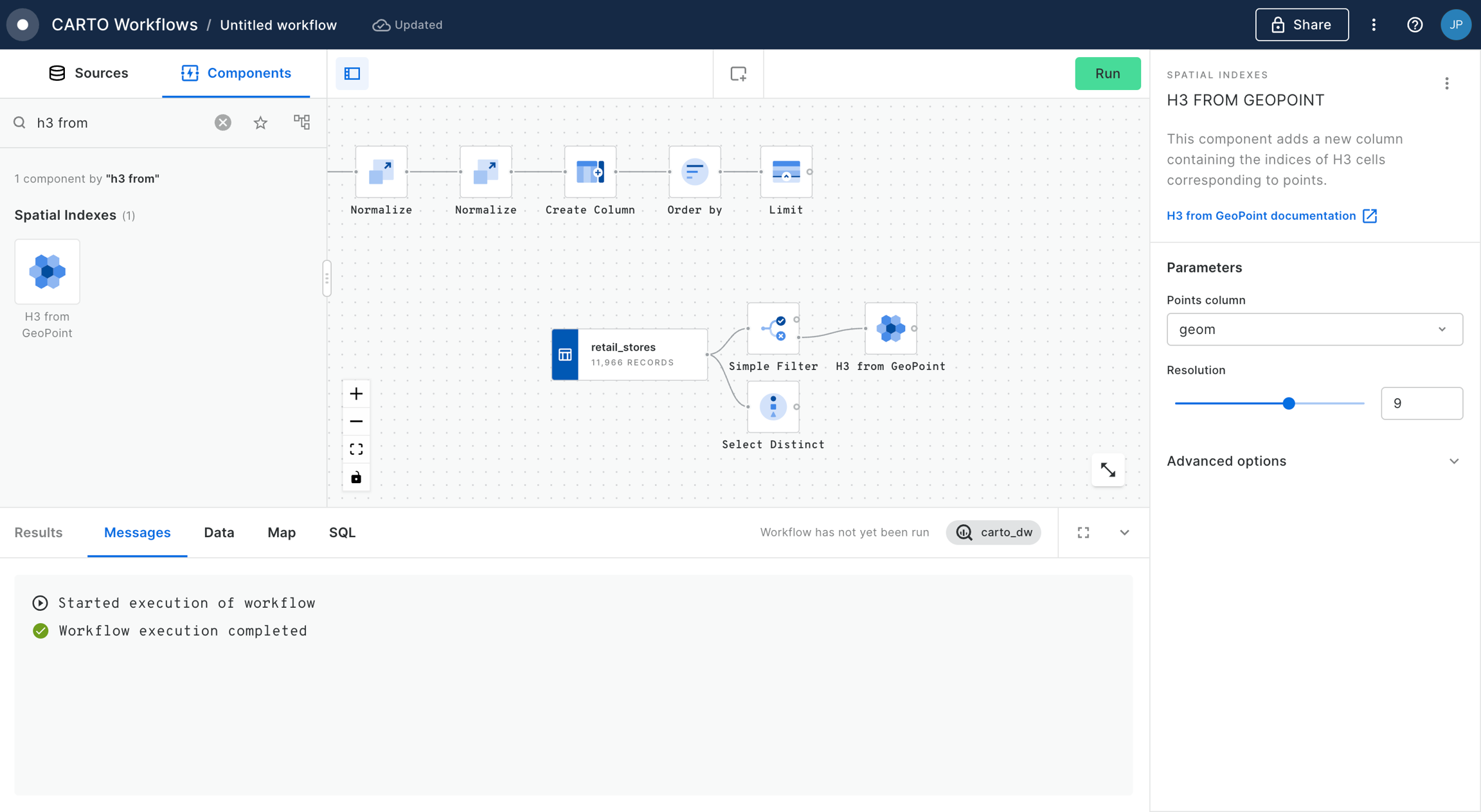 From the previous step we are interested in the stores that have not matched our filter, therefore we need to continue our workflow by selecting the second output (the one identified with a cross). We now want to create also the H3 cells where the relevant stores are located, using the same resolution as in the other part of our workflow. To do that we will add the H3 from GeoPoint component and add it to our workflow. We are going to connect the "Unmatch" output from the Simple Filter and we are going to select the 'geom' as the Points column and '9' as resolution. After running the workflow we now have the H3 Resolution 9 cells where we have target store located.