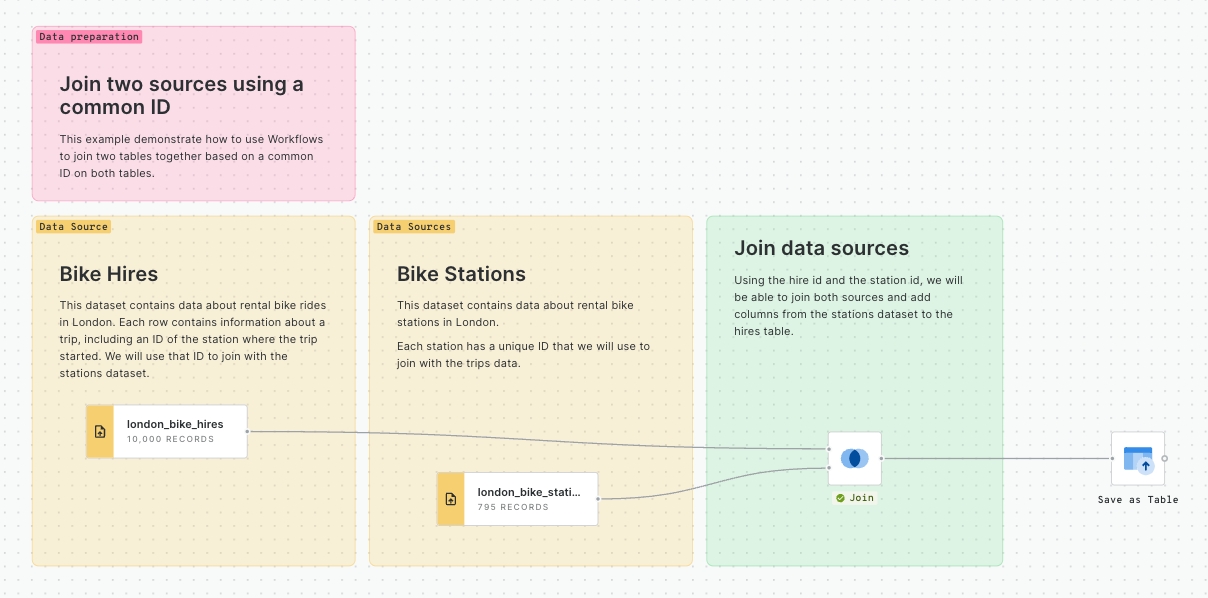 This example demonstrates how to use Workflows to join two tables based on a common ID on both tables.