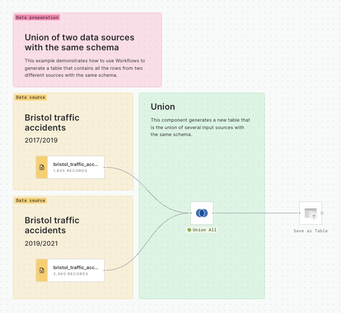 This example demonstrates how to use Workflows to generate a table that contains all the rows from two different sources with the same schema.