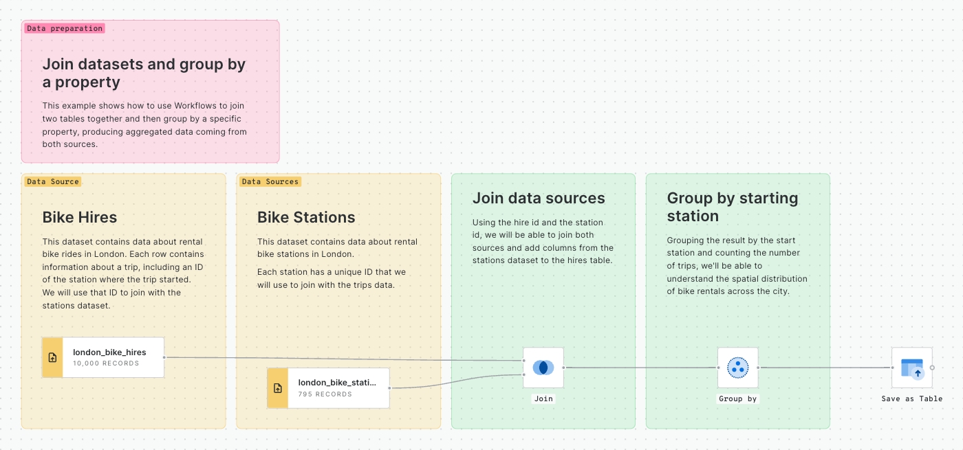This example shows how to use Workflows to join two tables together and then group by a specific property, producing aggregated data coming from both sources.