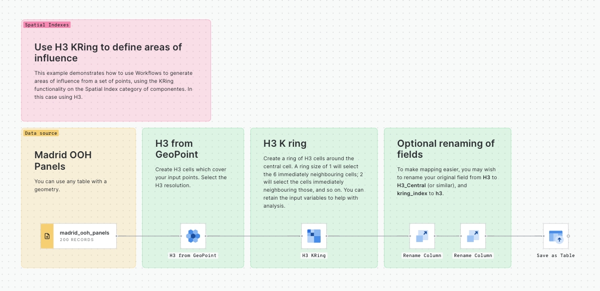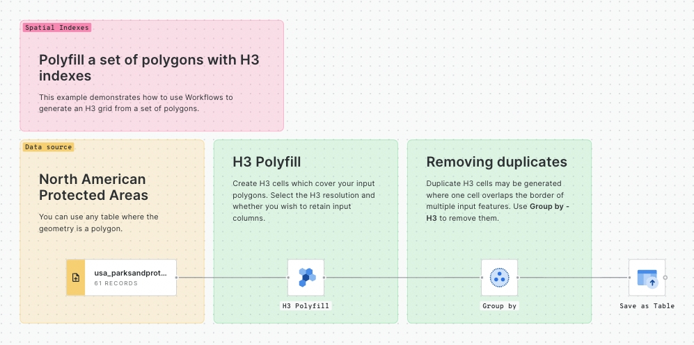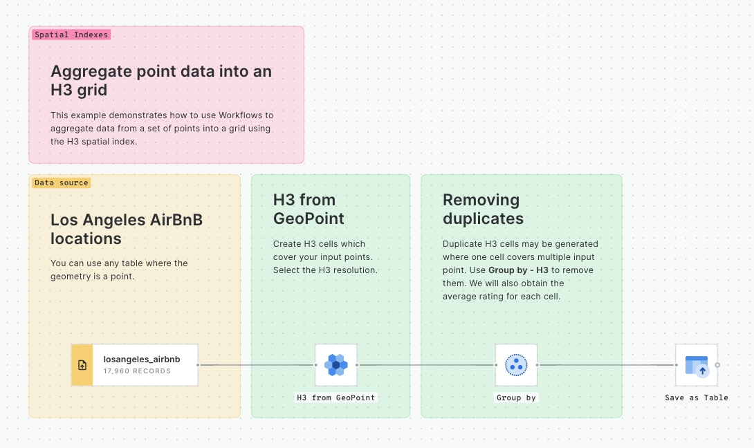This example demonstrates how to use Workflows to aggregate data from a set of points into a grid using the H3 spatial index.