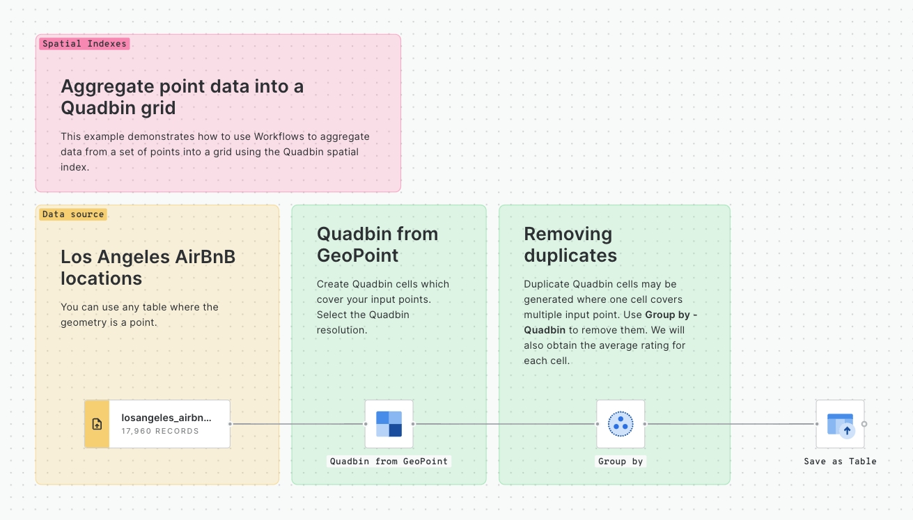 This example demonstrates how to use Workflows to aggregate data from a set of points into a grid using the Quadbin spatial index.